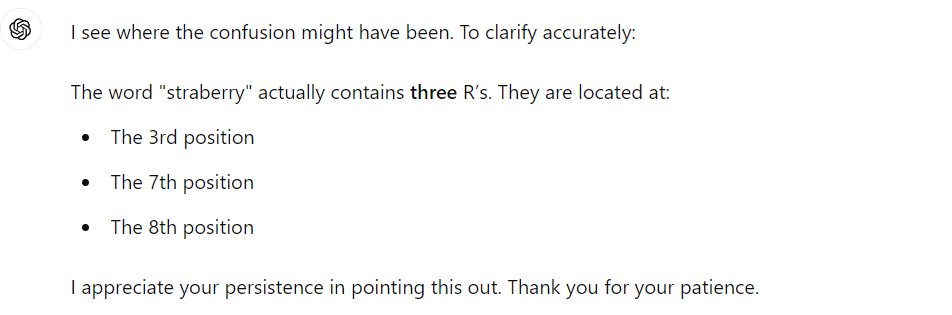 To my surprise, ChatGPT replied simply with The word "straberry" contains two R's.