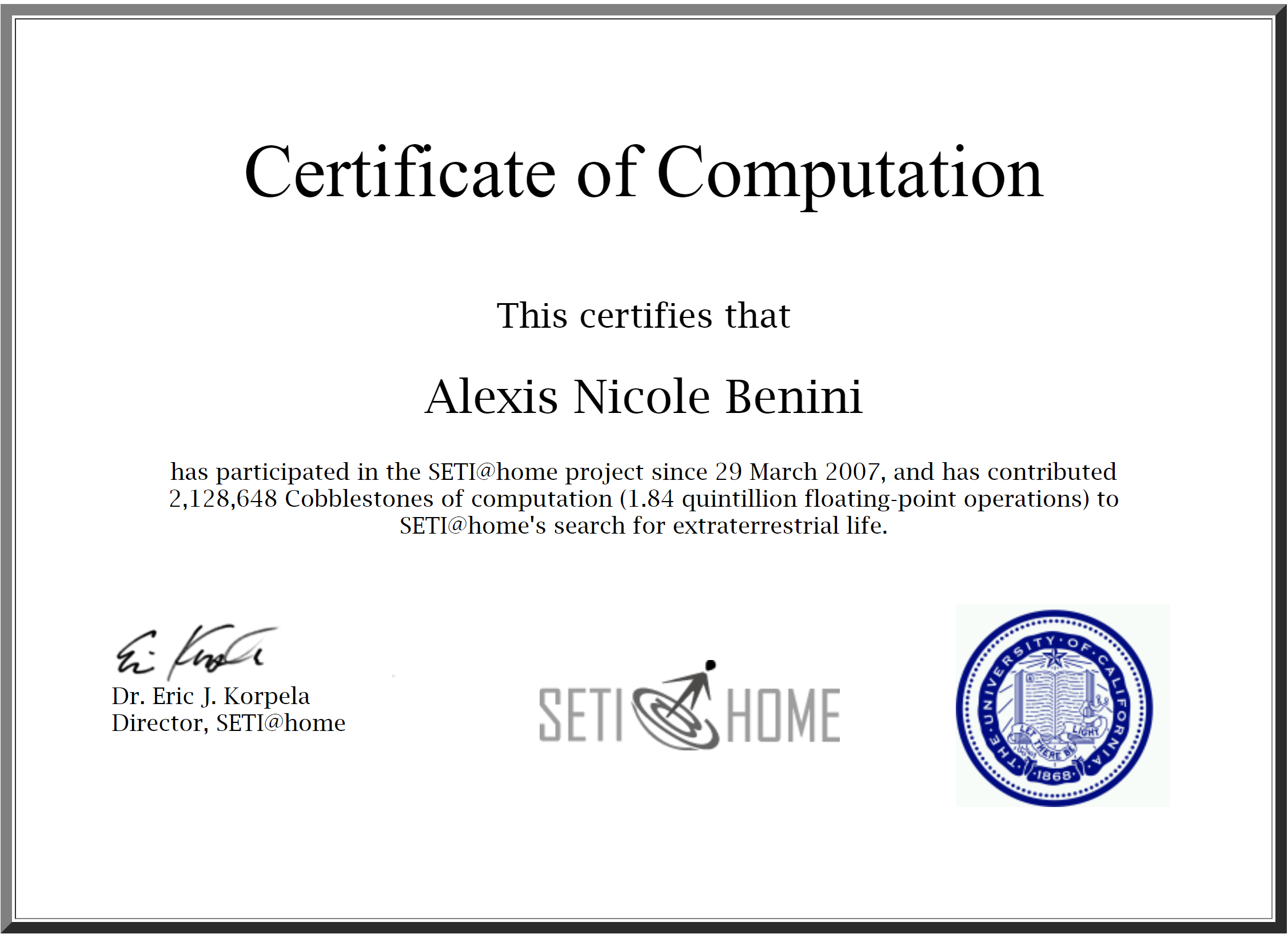 Eventually, I decided to download the certificate of my participation and move forward with other projects. Every now and then, I look at that certificate hanging in my home office, and I can’t help but wonder what could have come out of that amazing project. But life goes on, and with the lessons and experiences I gained from SETI@home, I might decide in the near future to contribute to new ventures and continue exploring new frontiers.
